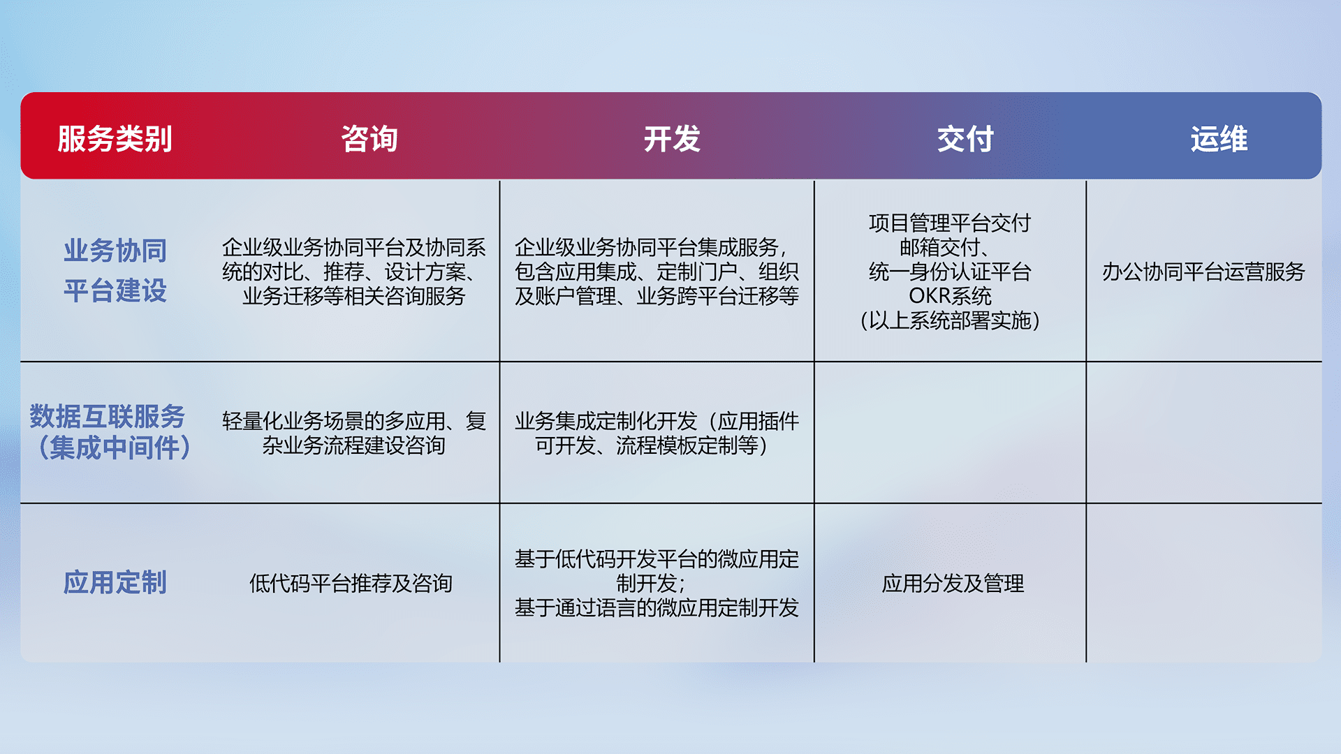 针对钉钉、、企微、、、IDaas等平台级产品提供产品的规划、、、、方案、、、交付、、定制化开发等服务,,,实现如统一协同办公、、、、智能客户服务、、、混合会议管理、、、智能数据查询、、等业务场景,,,,实现数字化转型。。